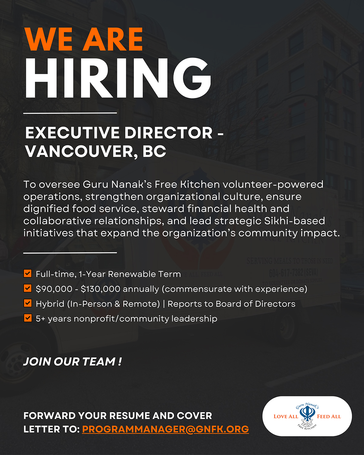 Since October  2006, Guru Nanak’s Free Kitchen (GNFK) has been feeding those in need in the Downtown Eastside Vancouver (DTES) and other areas in the Lower Mainland (BC), under the principles of Guru Nanak, Love All Feed All.